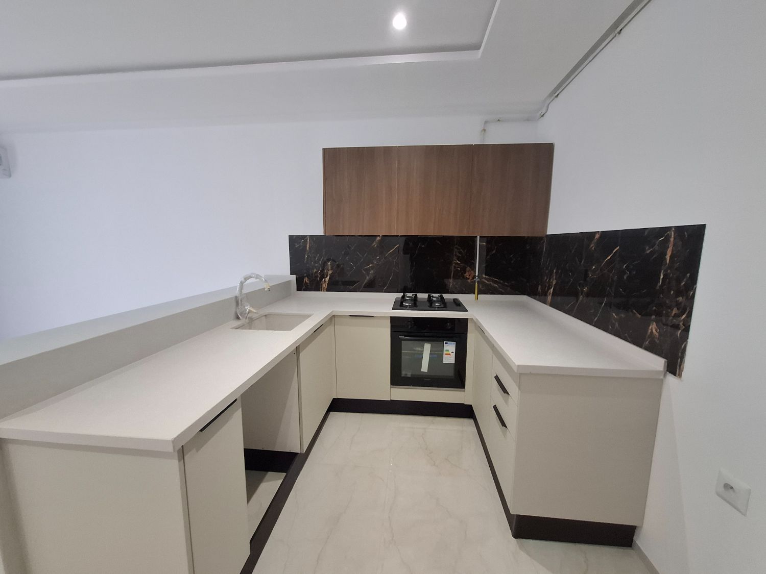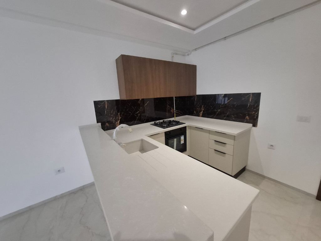 Finitions et équipements : porte massive, aluminium TPR noir sablé, revêtement de sol marbré 60×120, placard aménagé, cuisine en bois stratifié anti-humidité avec système soft-close, plaque/hotte/four Premium, évier Roca, clim Hyundai Inverter, chaudière ChauffoTherm, radiateurs avec thermostat intelligent, pré-installation lave-vaisselle et machine à laver.